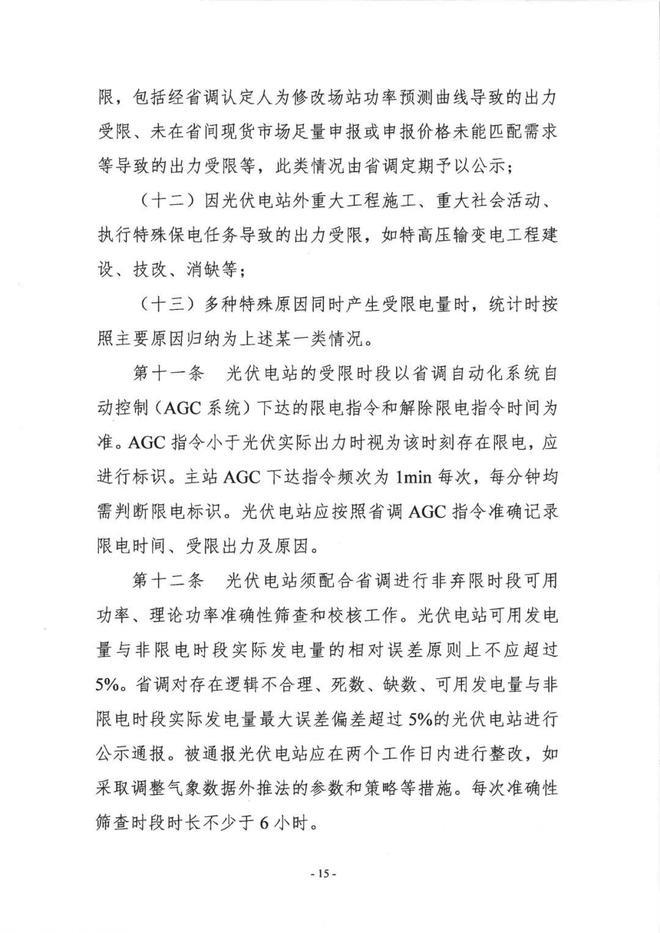 光伏電站可用發(fā)電量與非限電時(shí)段實(shí)際發(fā)電量的相對(duì)誤差原則上不應(yīng)超過5%。省調(diào)對(duì)存在邏輯不合理、死數(shù)、缺數(shù)、可用發(fā)電量與非限電時(shí)段實(shí)際發(fā)電量最大誤差偏差超過5%的光伏電站進(jìn)行公示通報(bào)。